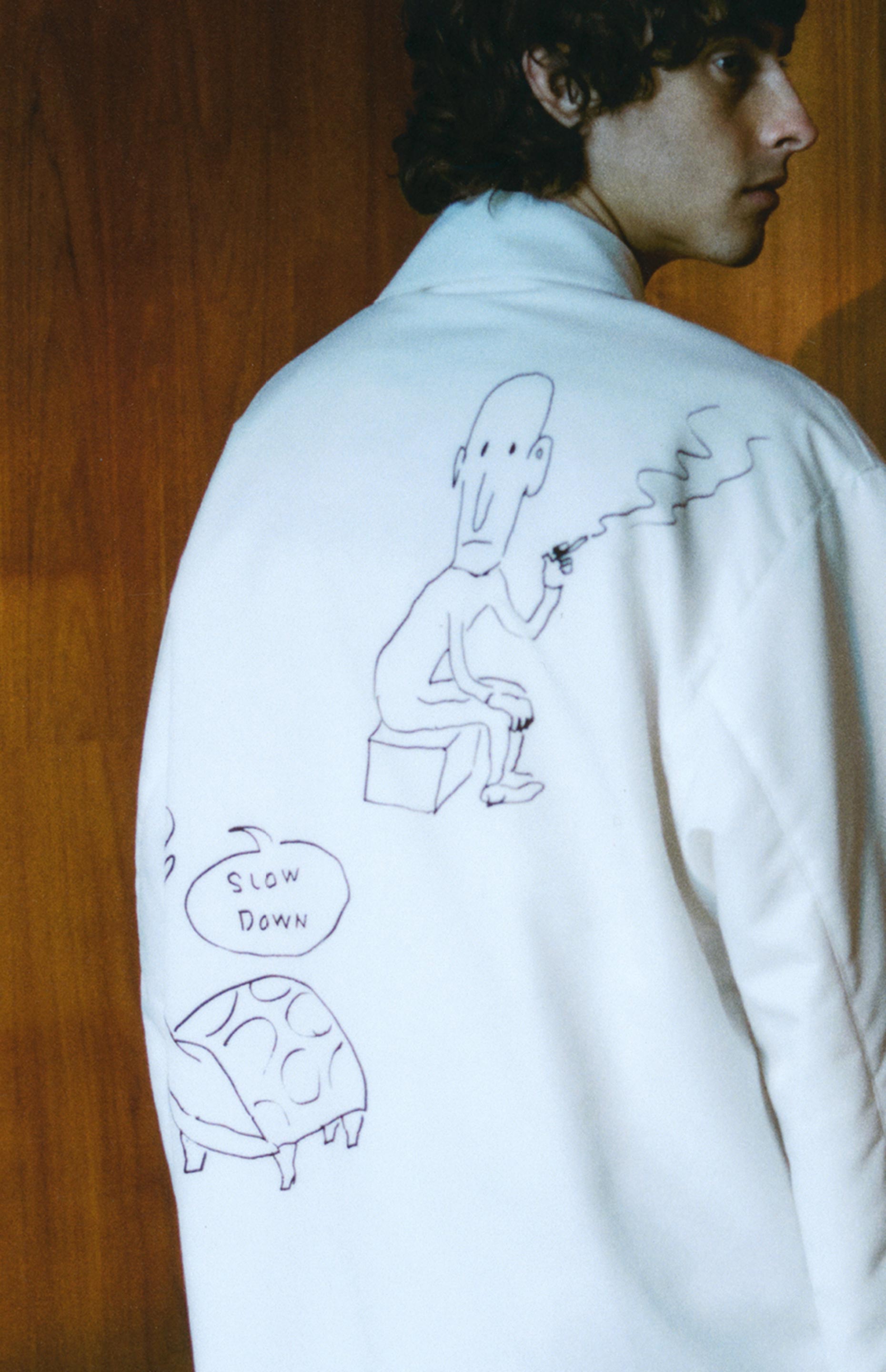 OAMCは、ダニエル・ジョンストンのアートワークを取り上げた6ピースコレクションを開発しました。このシリーズには、パッド入りのコーチジャケットとナイロンギャバジン製ボンバージャケット、再アレンジしたヴィンテージの U.S.ミリタリー サープラス M-65 ライナージャケット、イタリア産コットンフリース製のクルーネックスウェットシャツとパーカ、そして半袖Tシャツが含まれます。