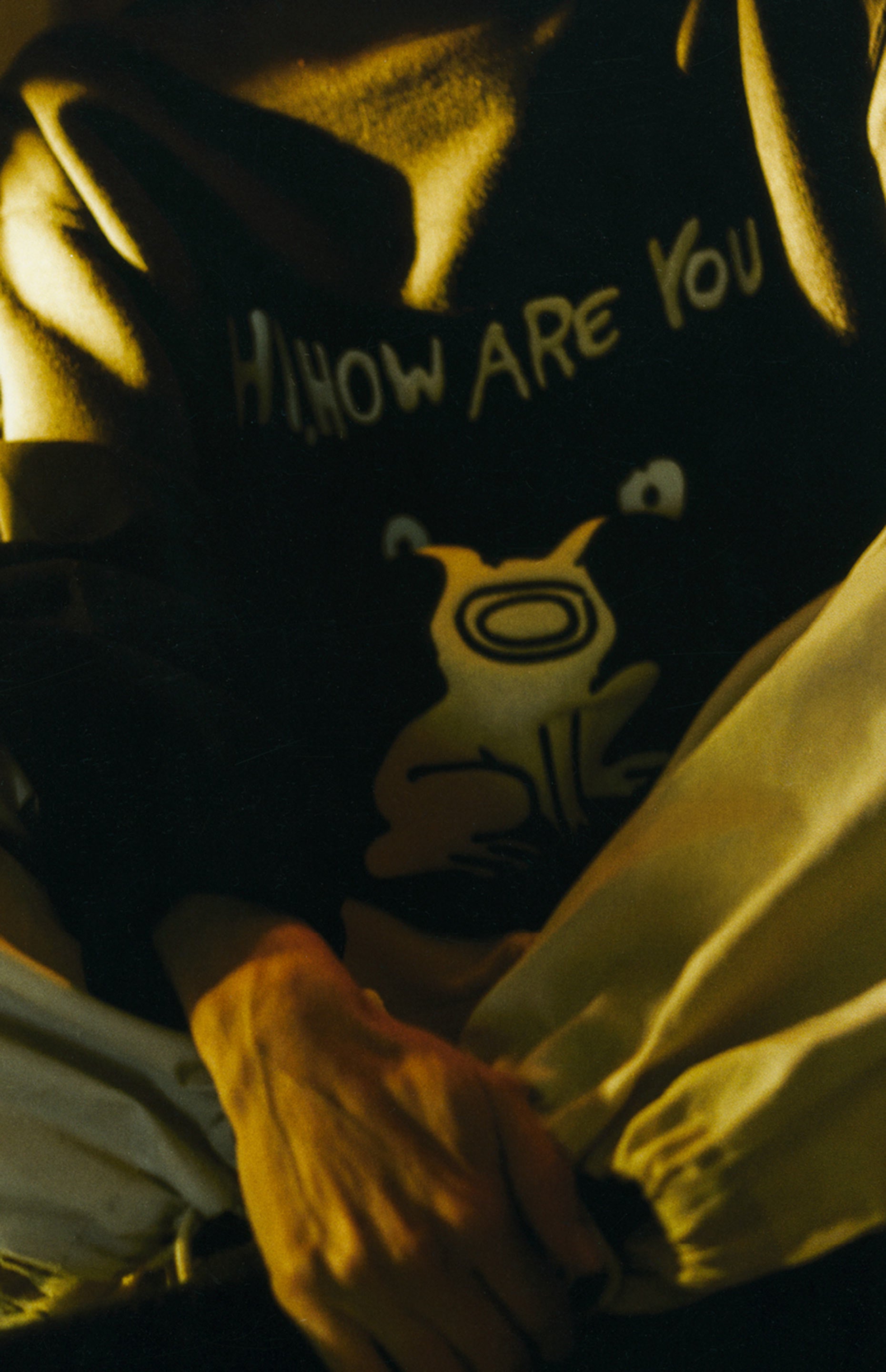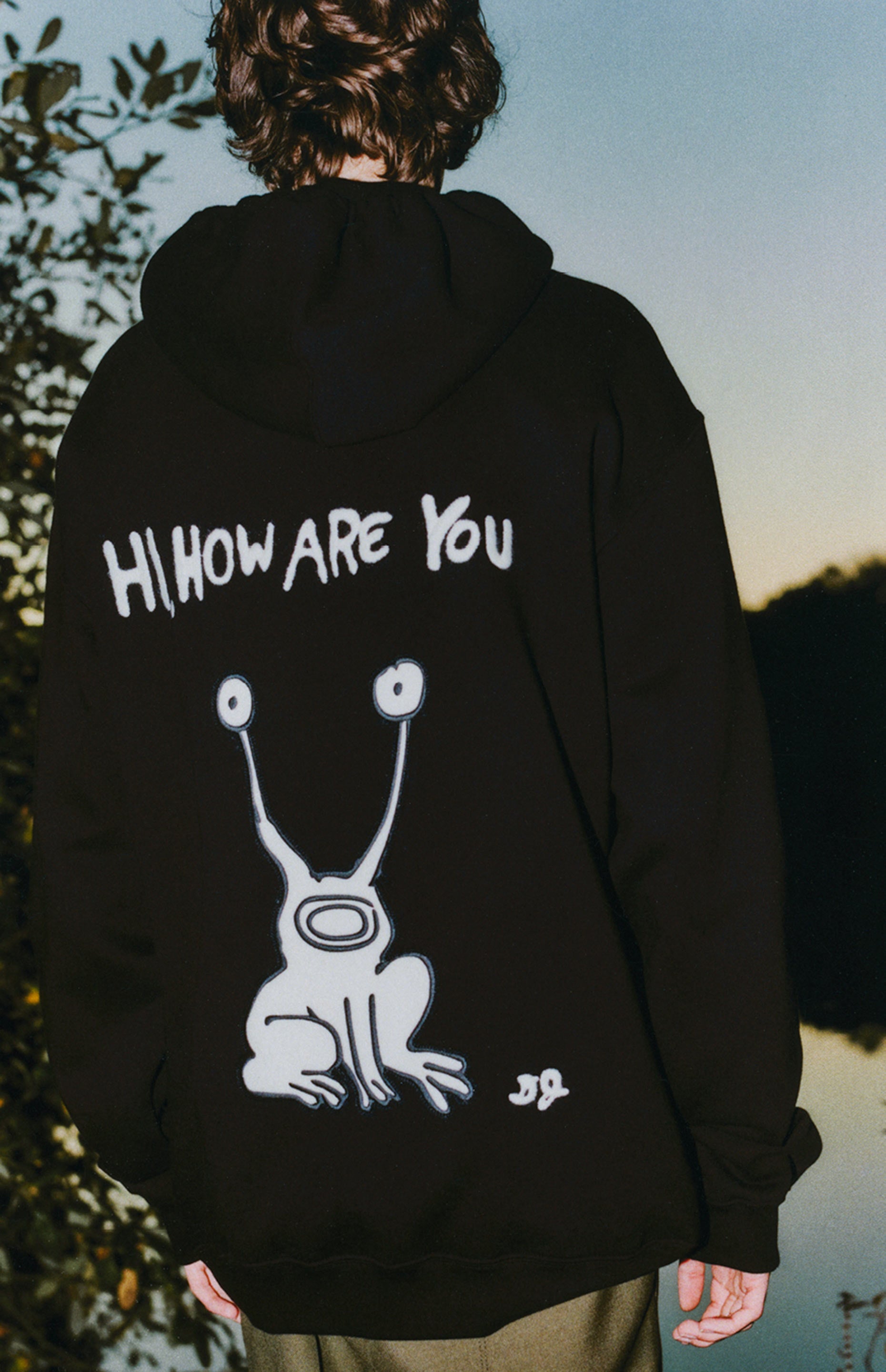 ダニエル・ジョンストンのエレミヤ・ザ・イノセントと「Hi, How Are You」のウール刺繍でライナー、クルーネックスウェットとフーディを飾り、ダニエル・ジョンストンのノートブックから採った他のアートワークを、特殊レジンでコーティングしたコットン製ワッペンや、ウェアに直接プリントしました。