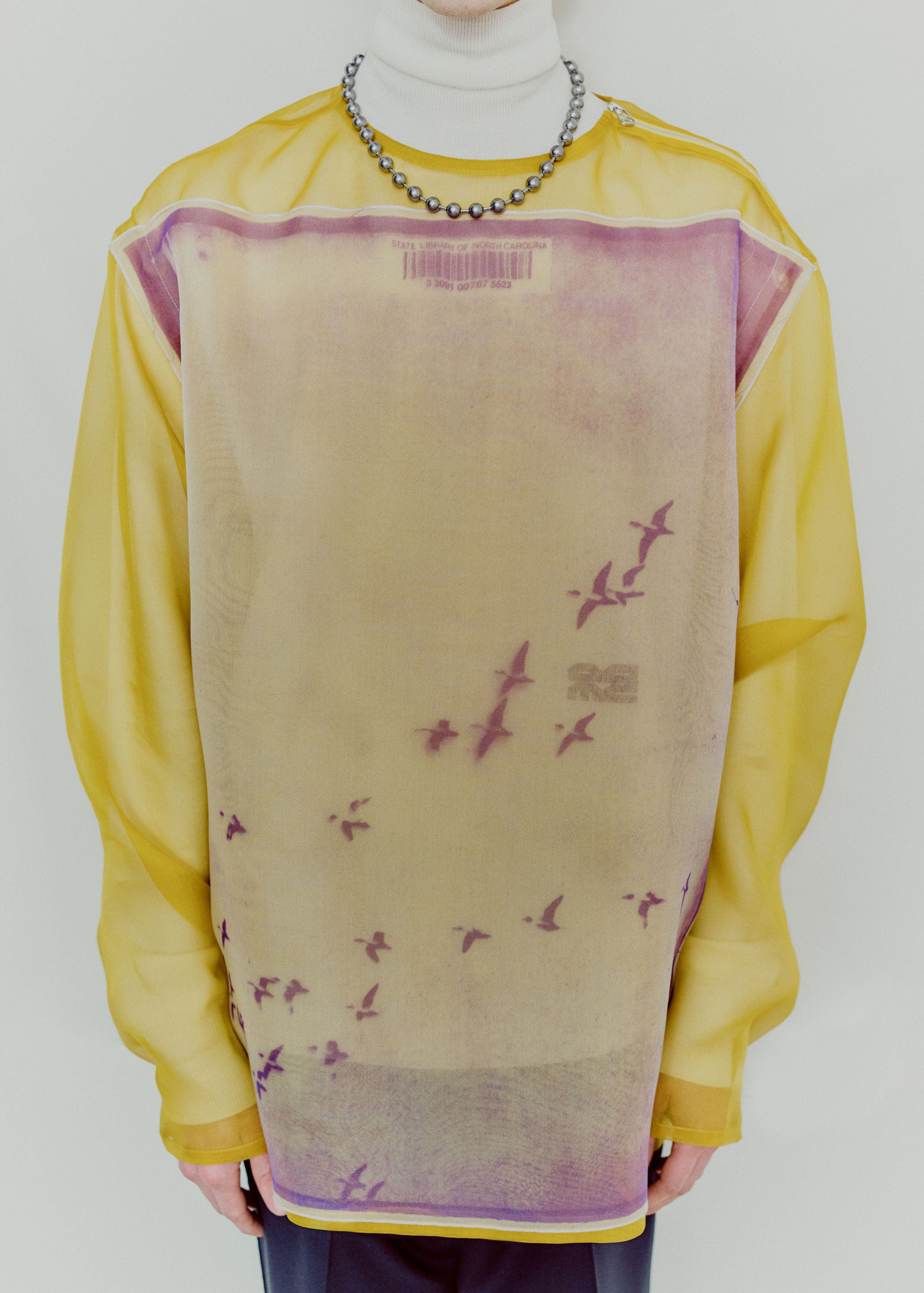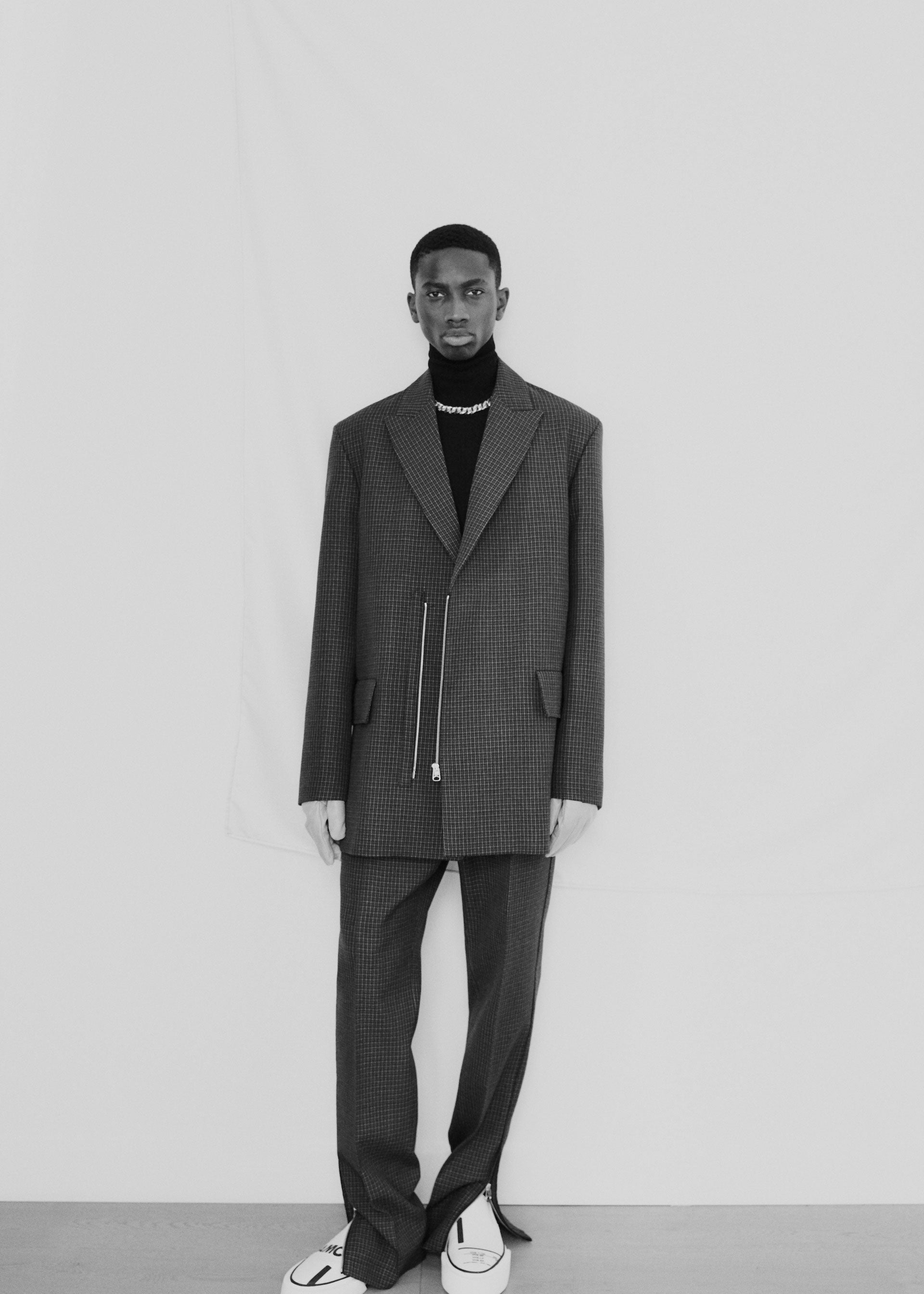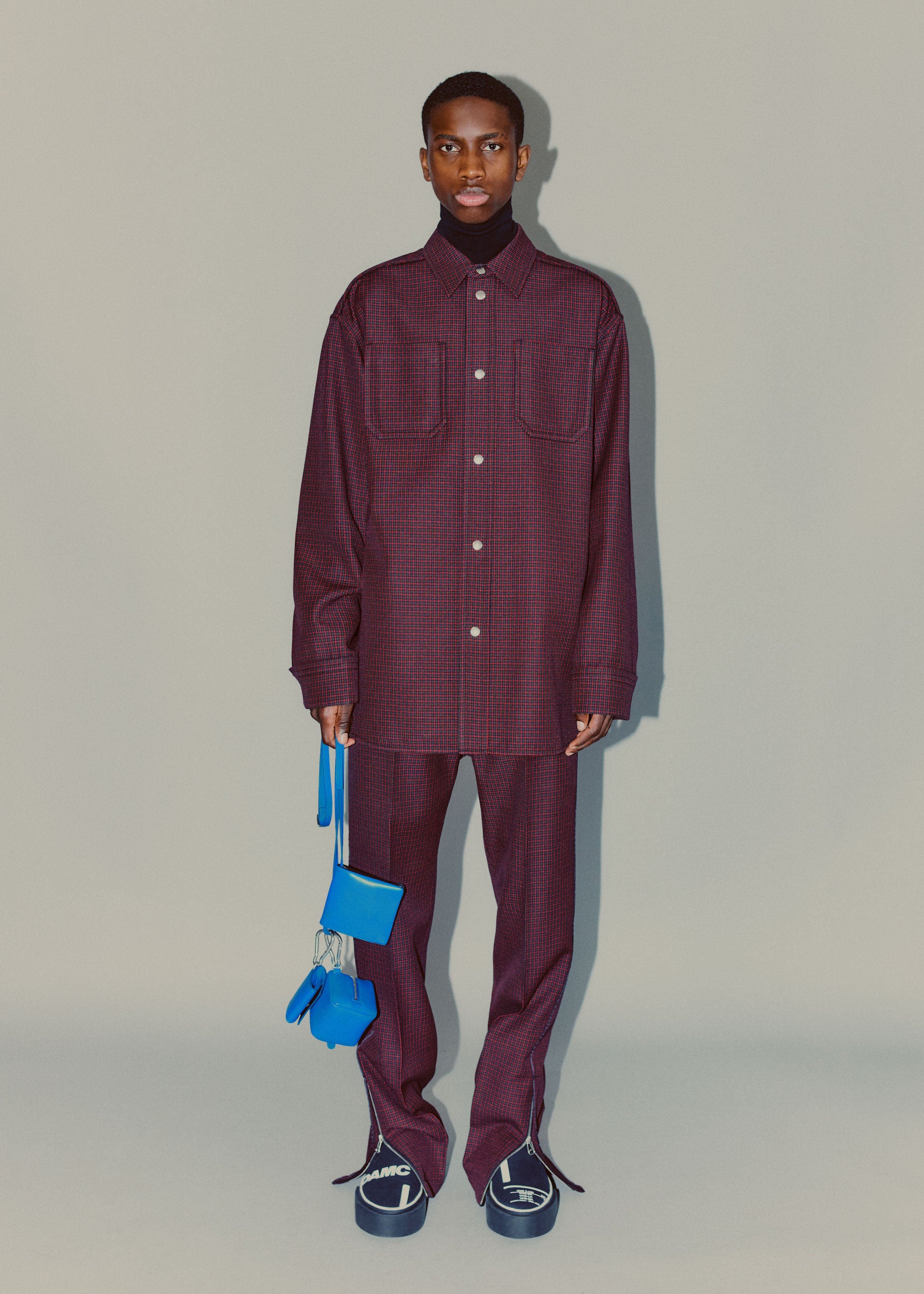 Collages and assemblages. In Rauschenberg’s vocabulary, ‘combines’. The idea of mixing materials, which Rauschenberg gained through his experience in his first year at the legendary black mountain college, under the guidance of Josef Albers. This idea is often at the root of design: finding the correct balance and vibration between two different materials, colors, or techniques, and was the initial starting point for the Fall/Winter 2021 collection. Mixed materials take the form of organza panels applied to sharp Japanese wool or cotton poplin overshirts, chunky knit collars attached to wool coats, and heavy metal hardware cutting through tailoring, shirting, footwear, and accessories.