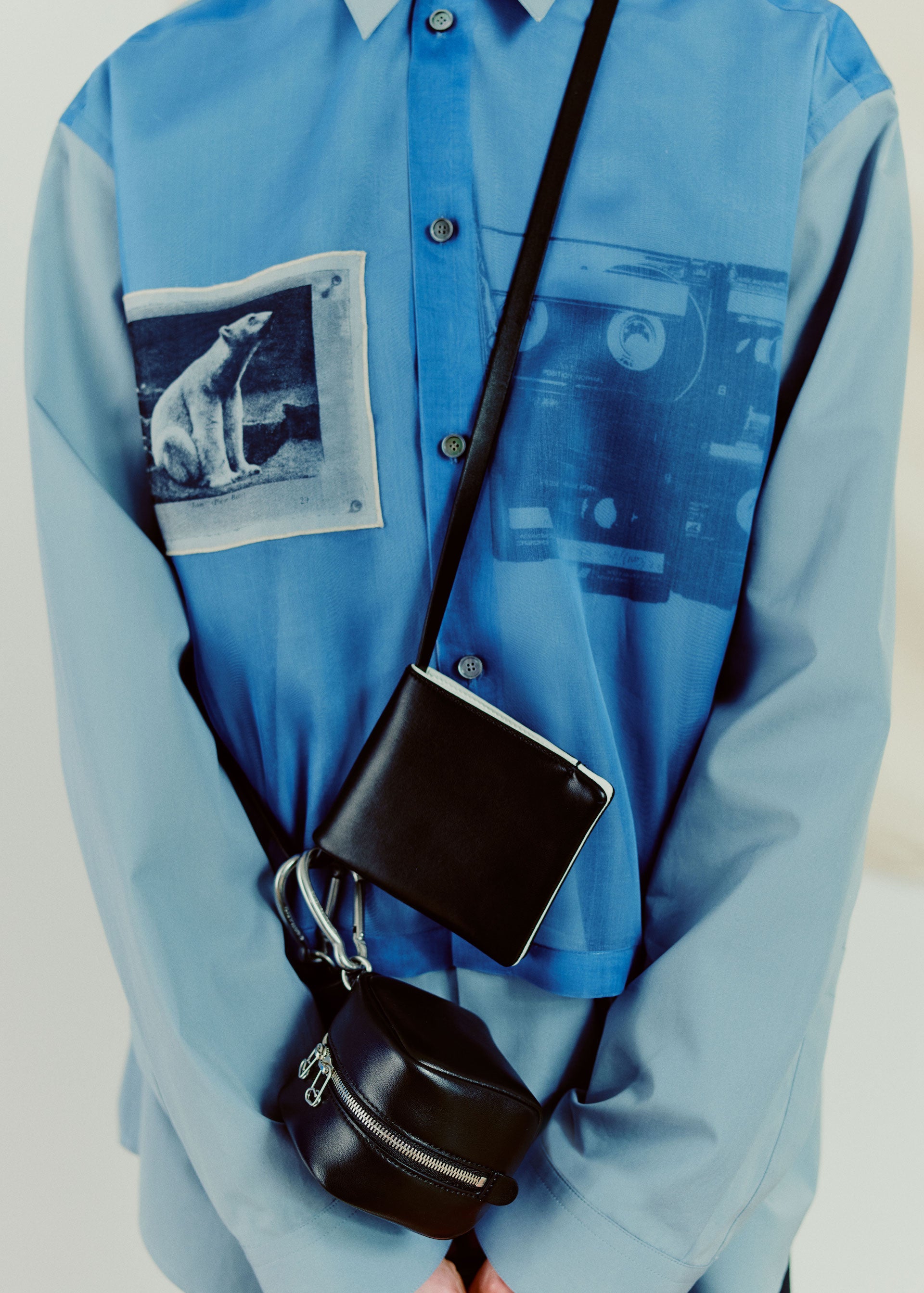 Accessories reflect both the collage approach as well as transparency. Gloves are mixed material and industrial, bags and cross-body small leather goods are supple and inflated, with hard metal detailing, and necklaces are strong link metal chains intricately woven with utility cords. Continuing the collaboration with adidas, OAMC has designed the Type O-9, featuring the bounce outsole and sculpted transparent TPU upper pieces that envelop the shoe, revealing the high-pile suede and leather panelling underneath. Utility boots are flooded in color, featuring custom tinted Vibram outsoles.