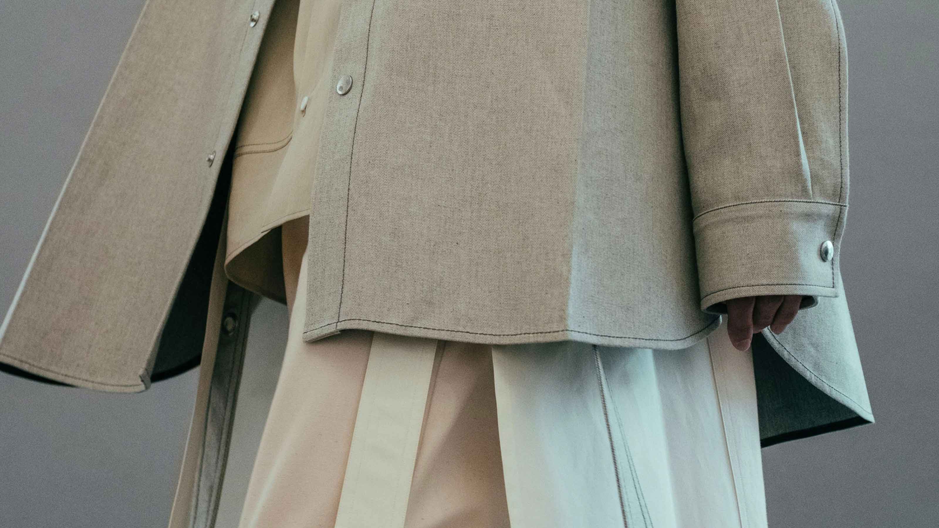 The silhouette is light and layered. Billowy topcoats, belted and cinched with industrial hardware, are layered over raw-edge cut cheesecloth shirts. Boxy tailoring and utility shirts are pressed and angular, paired with narrow, sharp trousers, creating an elongated, elegant silhouette. Full shorts cut below the knee, and light, gathered, abbreviated drawstring trousers are paired with long rib socks or full length sock-boots covering the leg. Macro textured diagonal ribbed knits and open-stitch double-face mohair cotton sweaters are layered over utility aprons or gathered and cinched at the waist. Sharp, geometrically cut leather shirts and coats are combined with printed voile foulards and shirts with motifs of Brancusi’s ‘Sleeping Muse’. Pillowy bags are strengthened by the attachment of sturdy leather strap handles, and foulards, both leather and fringed cotton muslin, are tied with a triangular shape. Light, layered silk quilting features painted watercolor motifs.