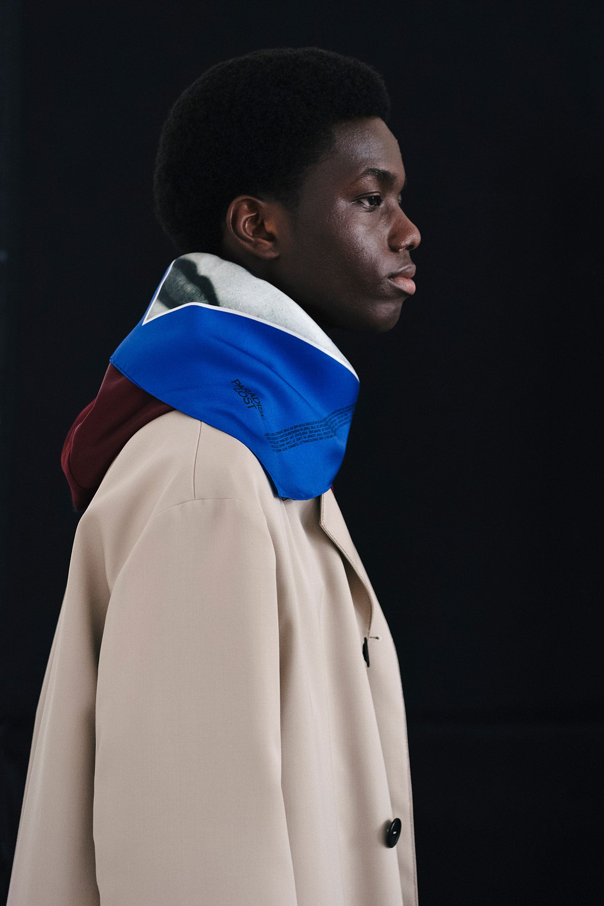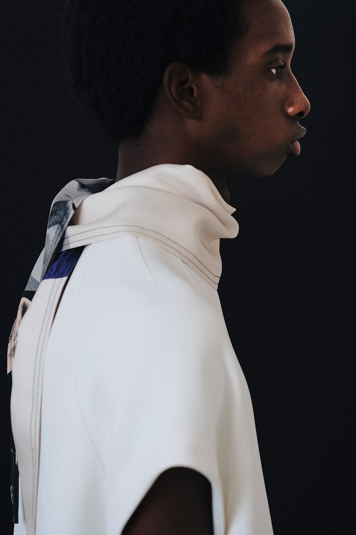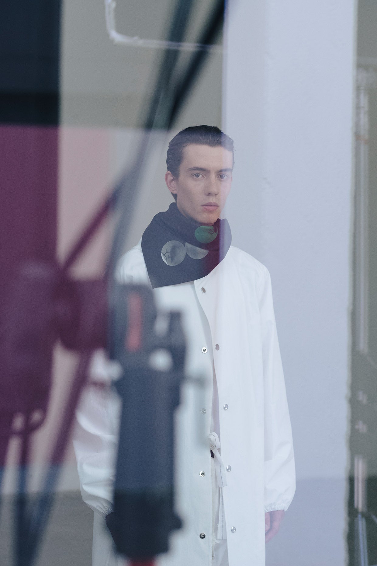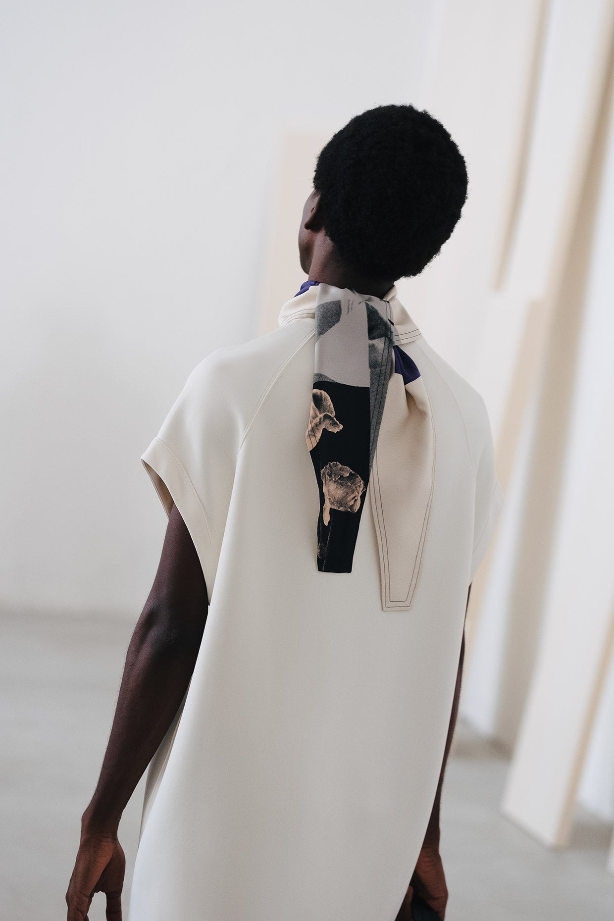 However, as the collection, mood, and circumstance developed, it was important to balance. To create a feeling of lightness, of hope, of positivity. Softer, more fluid fabrics were included and cut into coats, shirts, and trousers. Long, shaped foulards added an elegance and a sophistication.