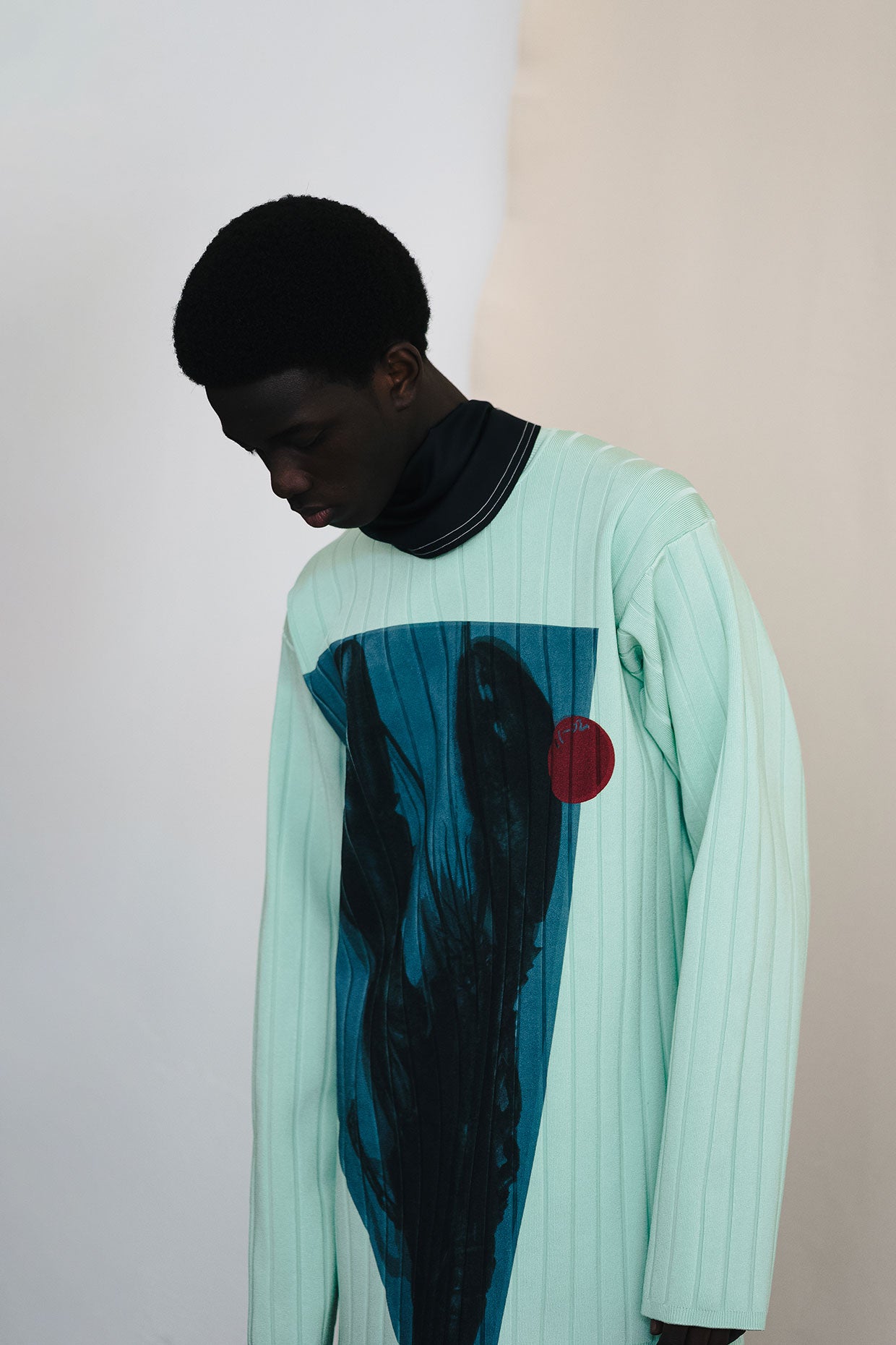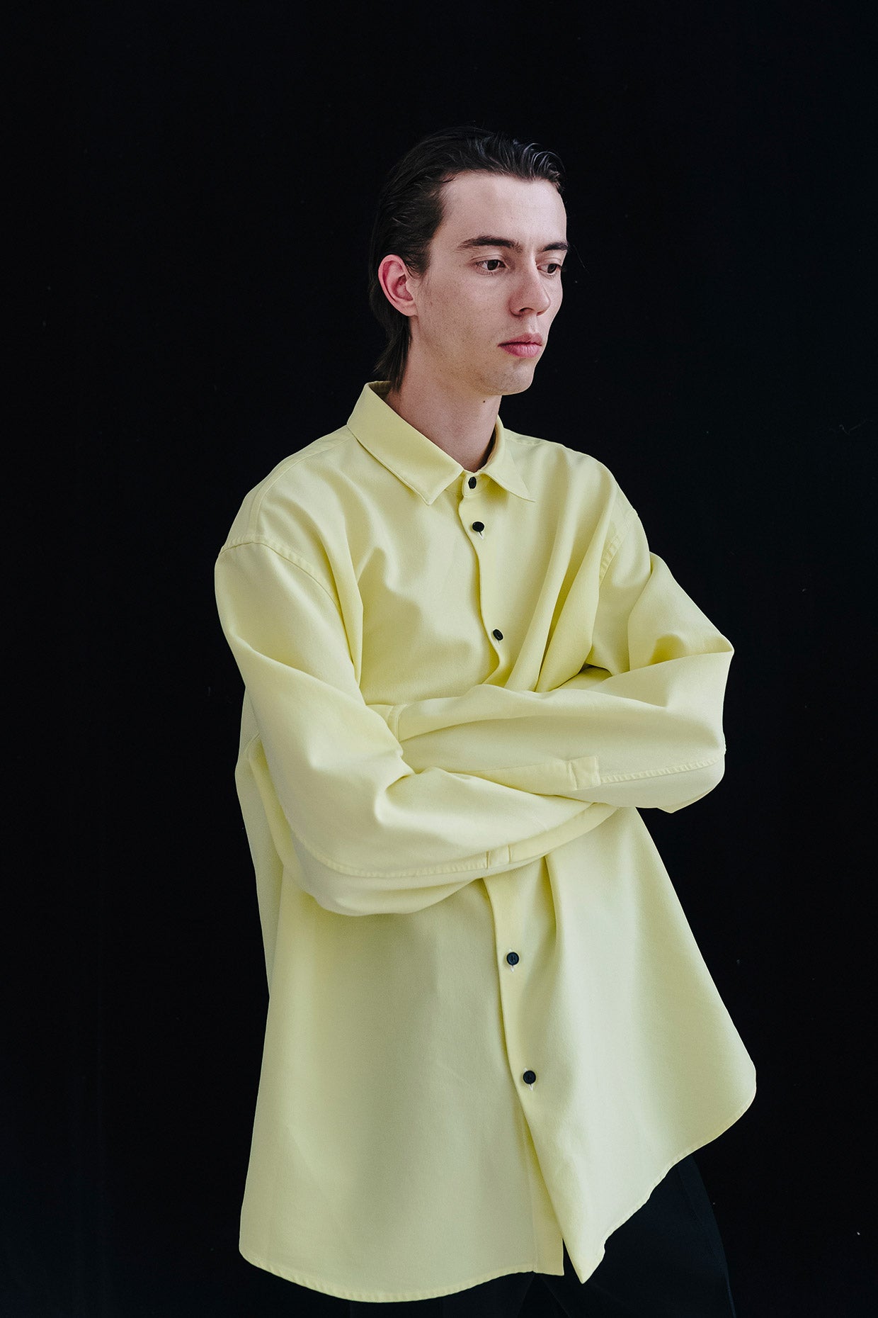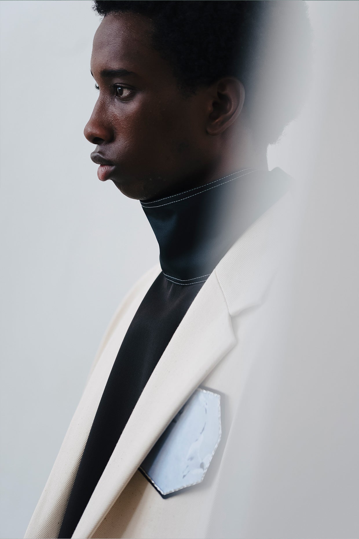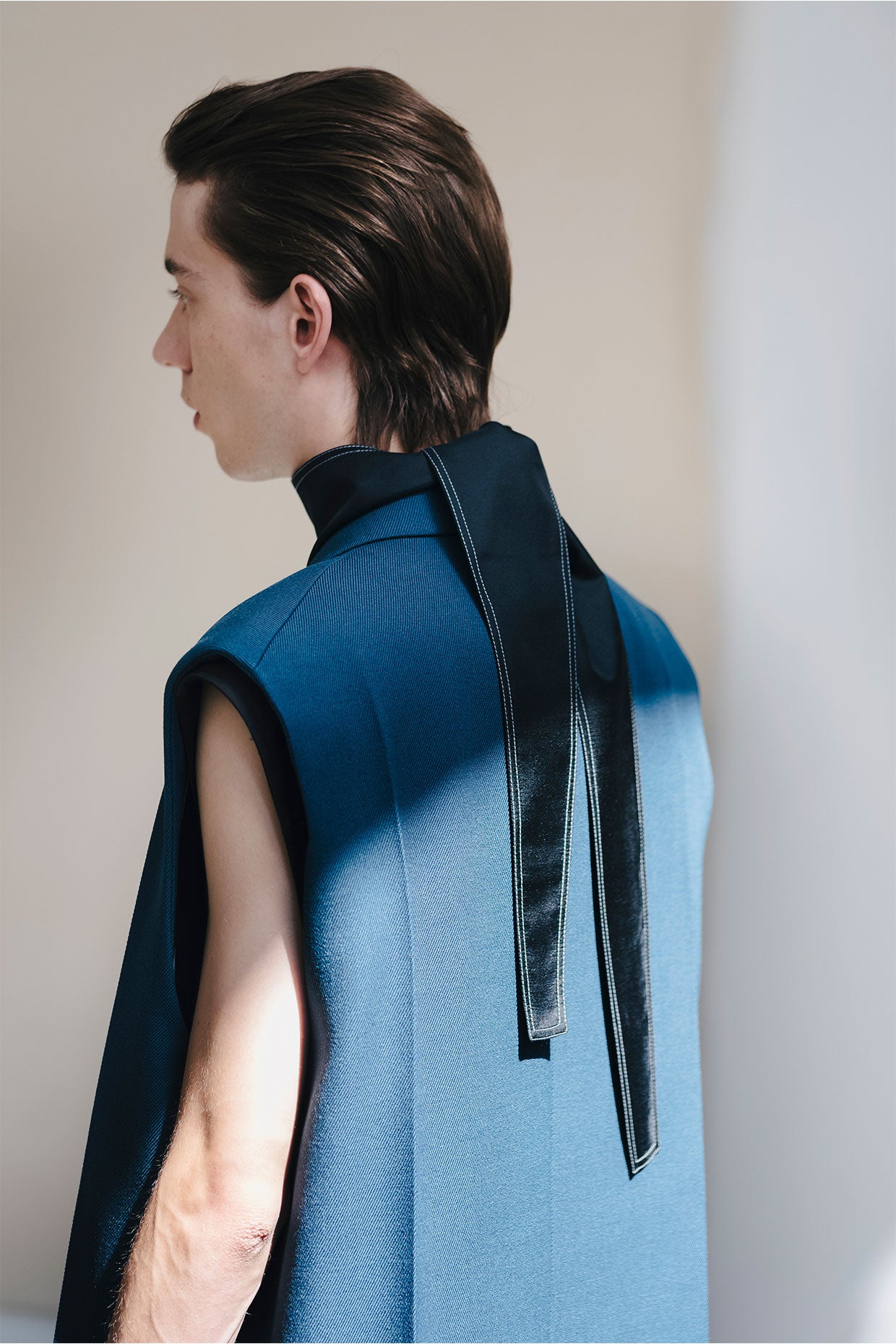 However, as the collection, mood, and circumstance developed, it was important to balance. To create a feeling of lightness, of hope, of positivity. Softer, more fluid fabrics were included and cut into coats, shirts, and trousers. Long, shaped foulards added an elegance and a sophistication.