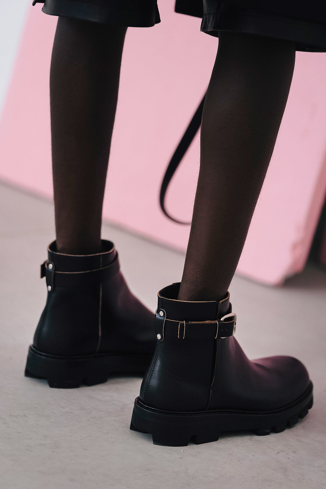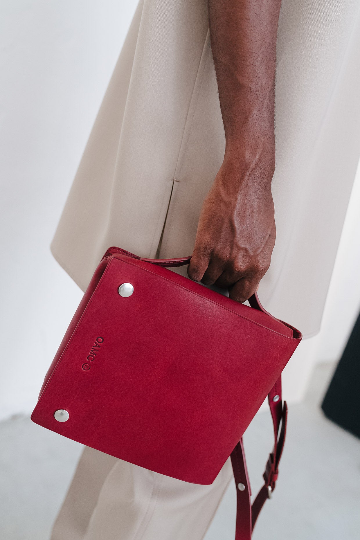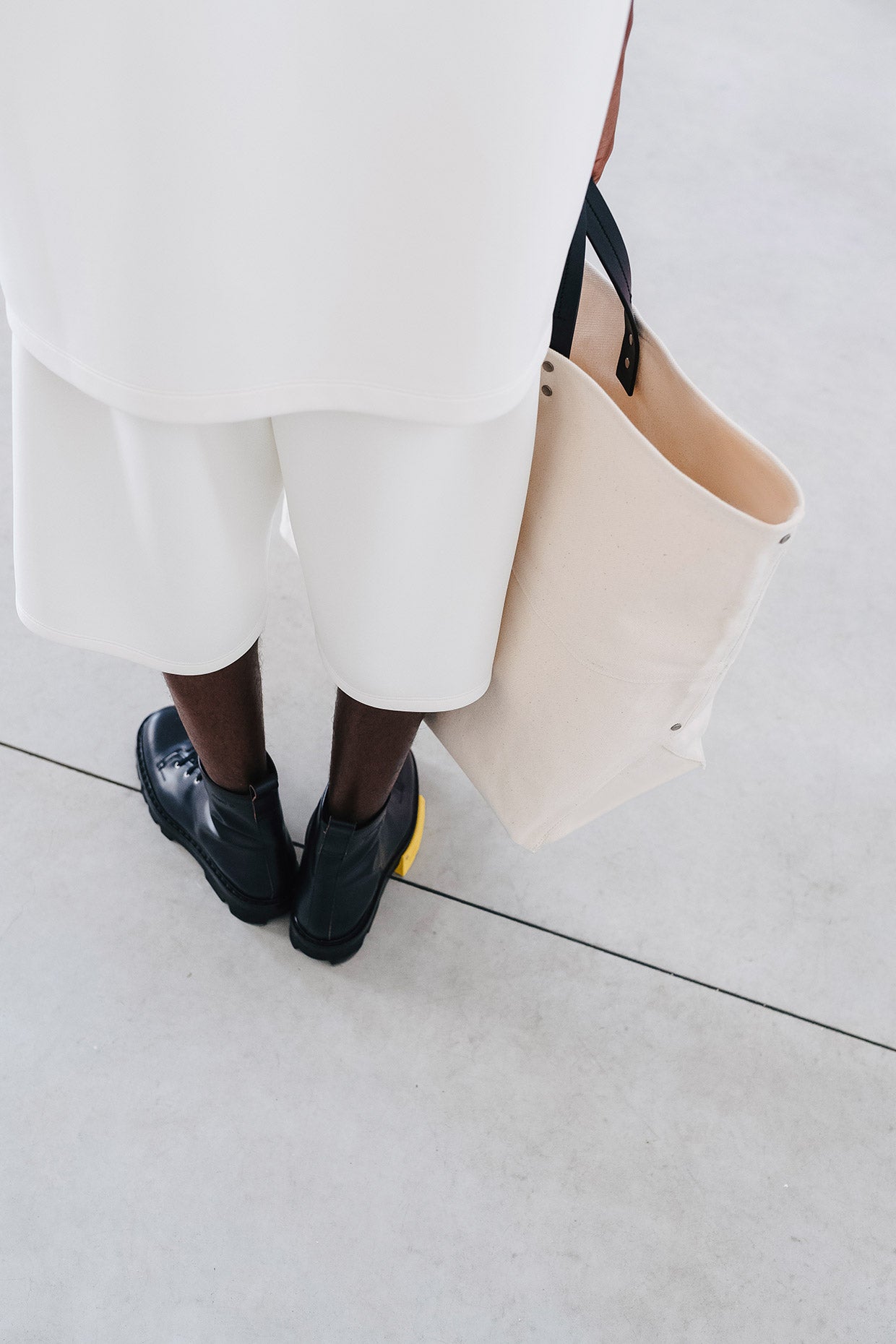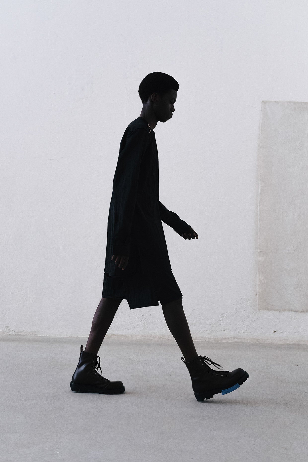 Shoes and boots are military in feel, with an asymmetrical custom lug outsole featuring a removable rubber insert which adds a color touch as well as a secondary tread pattern. The custom Free Solo sneaker outsoles have been utilized in a new, clean form, and vulcanized shapes are present. Bags are geometric, with cues coming from a functional utilitarian language: clean leather crossbody transit bags, oversized canvas tote bags, and soft inflated textured nylon messengers are all trimmed with hand painted and finished leather details and custom hardware. A necklace with a sterling silver mushroom pendant symbolizes resilience, continuity, and hope.