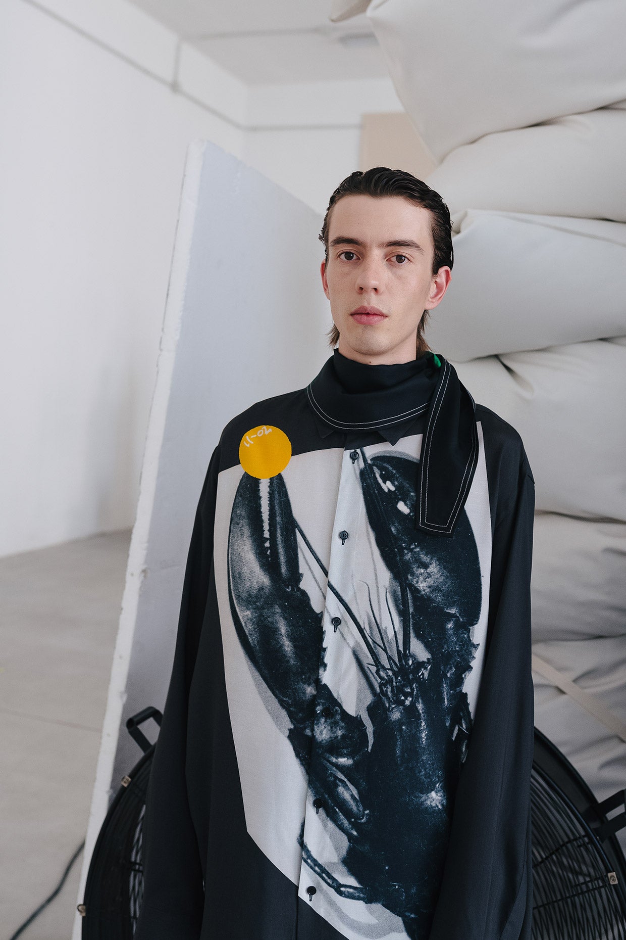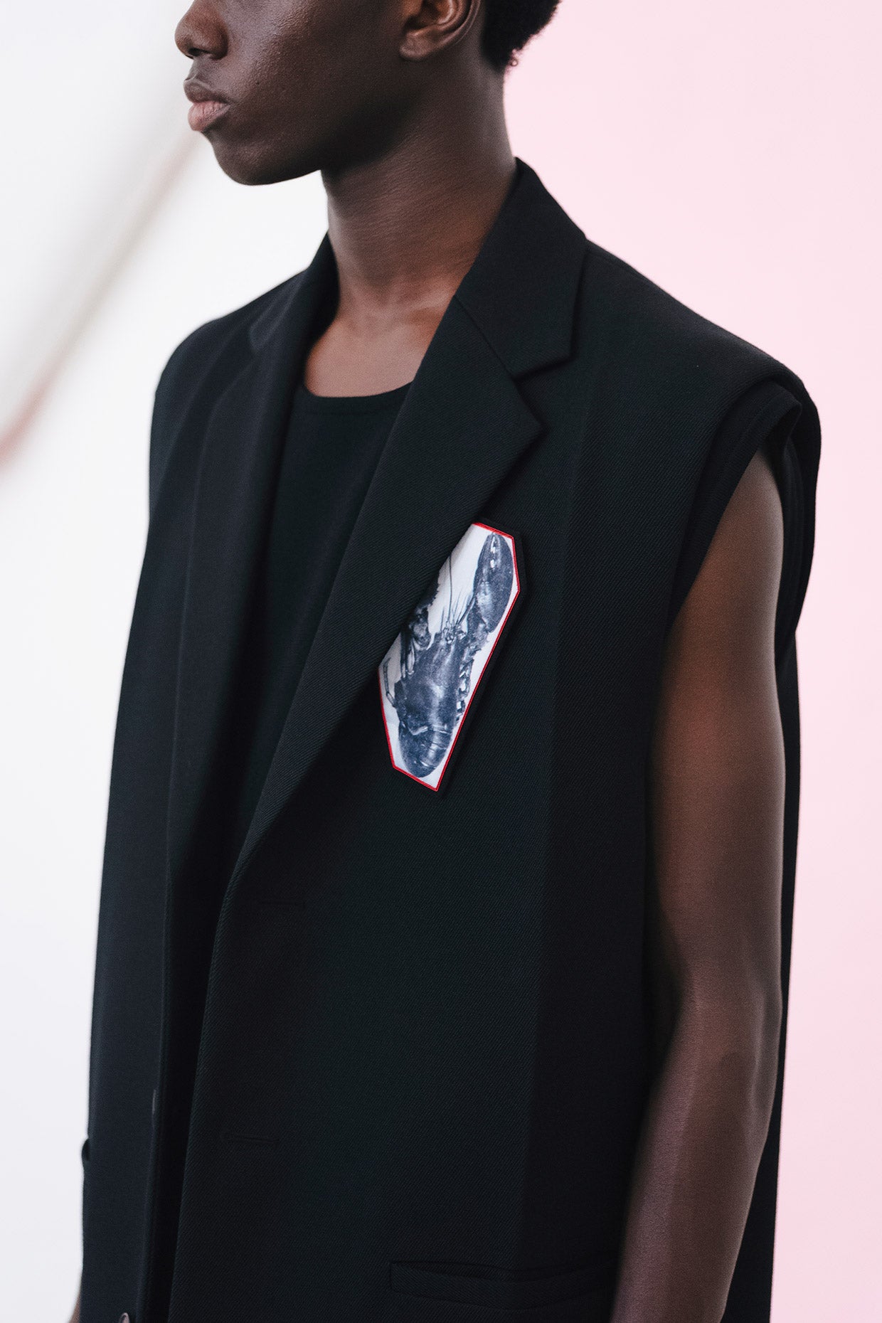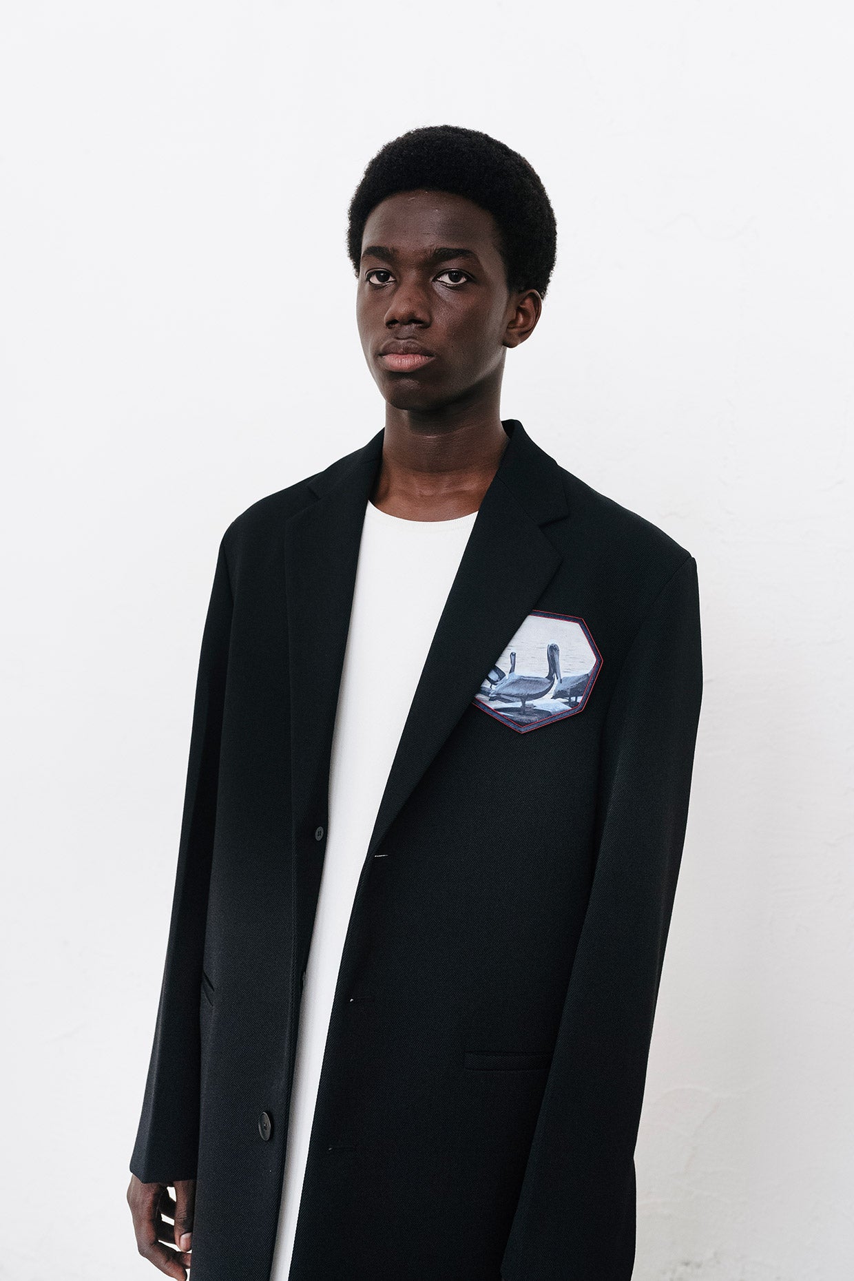 As the collection emerged, the visual language of the artwork also found a progressive point of view. Imperfect geometric forms were created by collaging and chopping up images, both found and created. The touch of human decoration and handwork, deliberately analogue. Patches that at once seem military are hand embroidered and add images of serenity, of flowers and sea birds, or of surreality, lobsters and pelicans. A commentary on how we can be resilient in this moment, and how it’s important to remember the beauty and softness in our world, no matter how strange things become.
